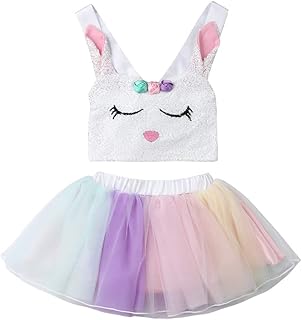 Girls Tulle Skirt Set Two Piece Ruffle Sleeve Unicorn T-Shirt Tutu Dress Summer Birthday Party Outfit 1-8 Years Old